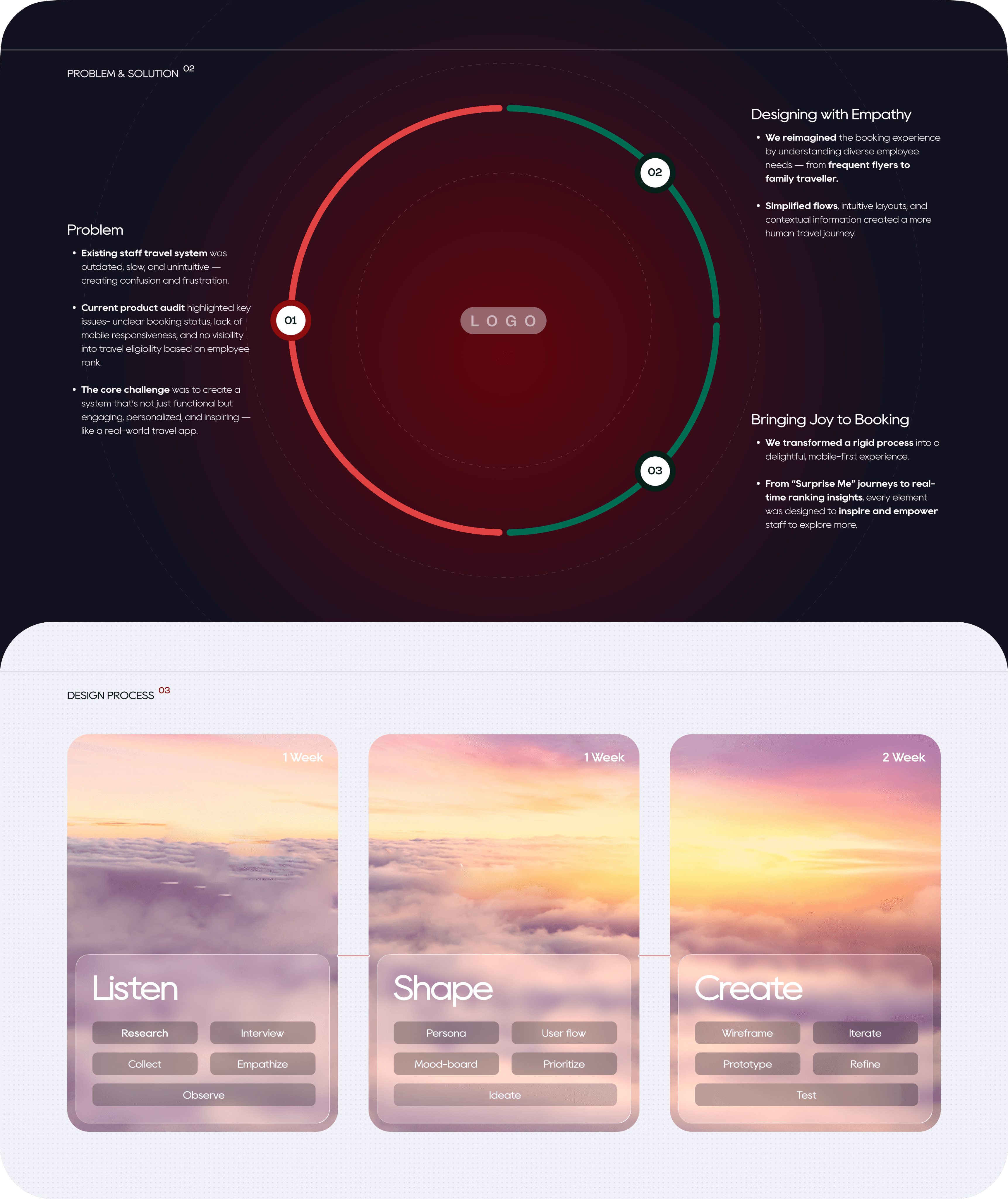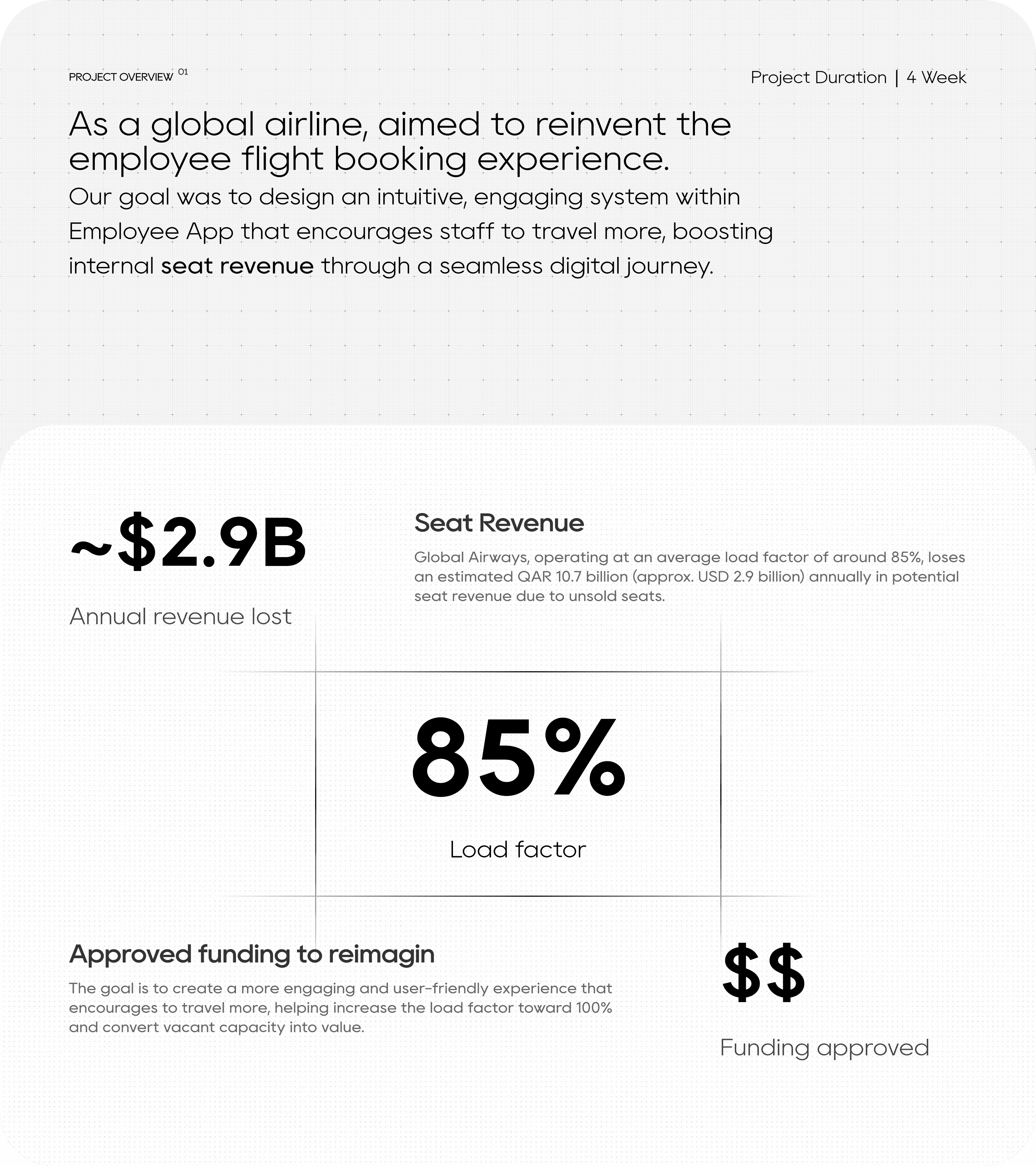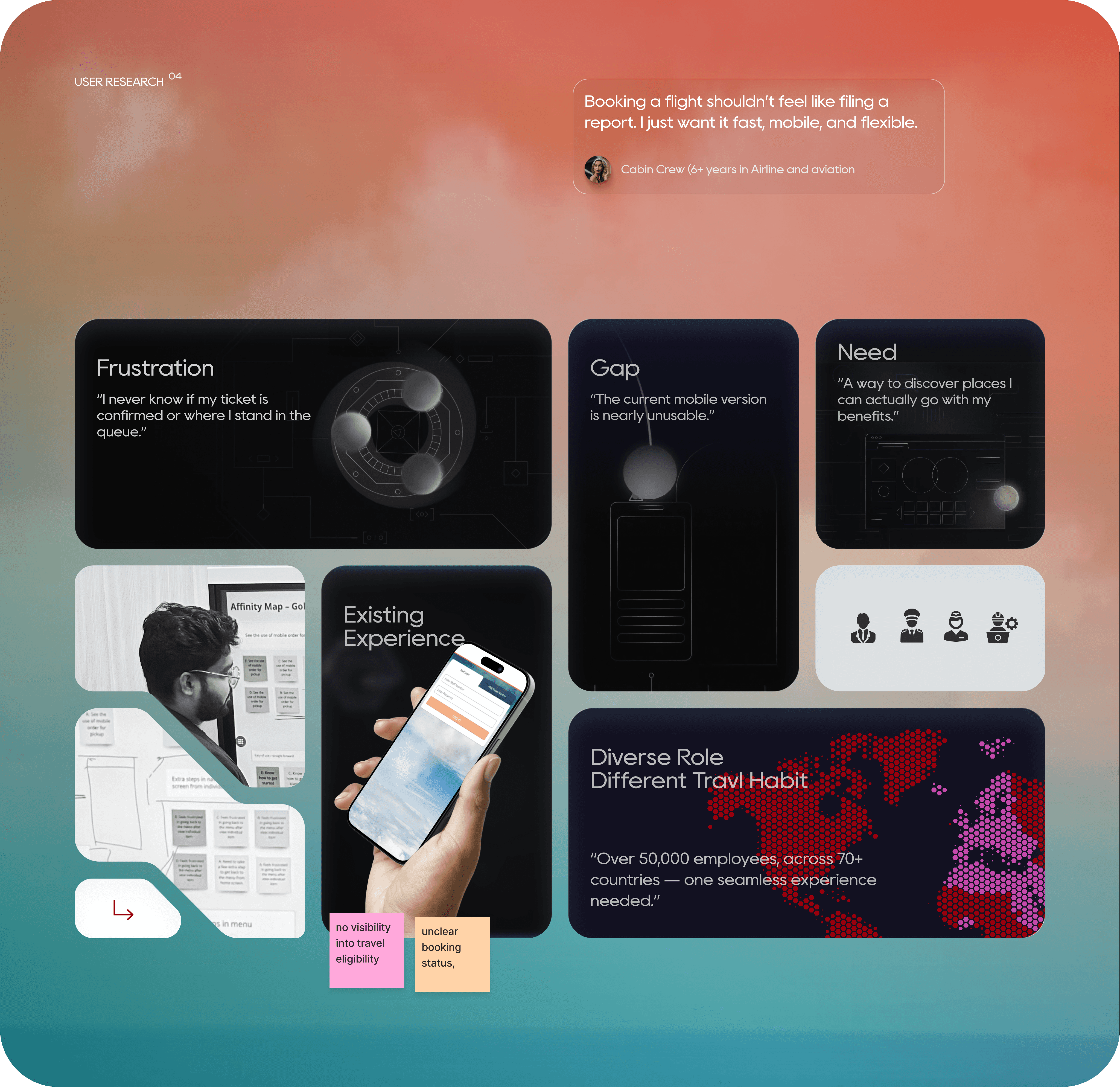 Employees found it difficult to explore and plan travel due to a cluttered and outdated interface. The lack of personalization and smooth onboarding discouraged engagement, while complex booking steps reduced adoption — limiting the company’s ability to increase internal seat revenue.